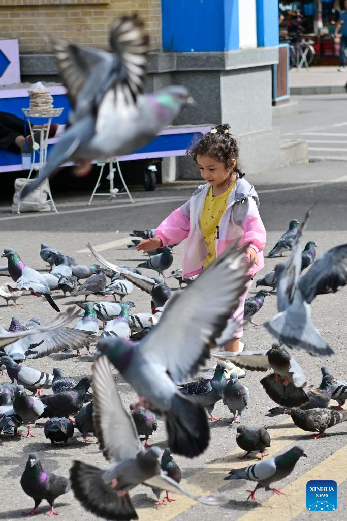 A girl plays with pigeons in Kazanqi folk tourism area in Yining City, Ili Kazak Autonomous Prefecture, northwest China's Xinjiang Uygur Autonomous Region, May 11, 2024. (Xinhua/Ding Lei)
