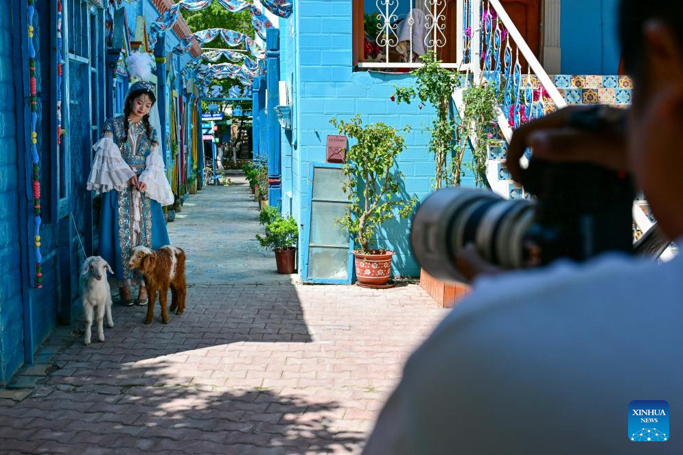 Tourists pose for photos on the Liuxing Street in Yining City, Ili Kazak Autonomous Prefecture, northwest China's Xinjiang Uygur Autonomous Region, May 10, 2024. (Xinhua/Ding Lei)