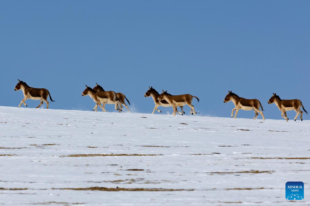 This photo taken on May 9, 2024 shows Tibetan wild donkeys at the Changtang National Nature Reserve in Nyima County of Nagqu City, southwest China's Xizang Autonomous Region. Dubbed the "paradise of wild animals," Changtang National Nature Reserve is home to over 30 kinds of wild animals listed on China's national-level protection catalogue, including Tibetan antelopes and wild yaks. (Xinhua/Jiang Fan)