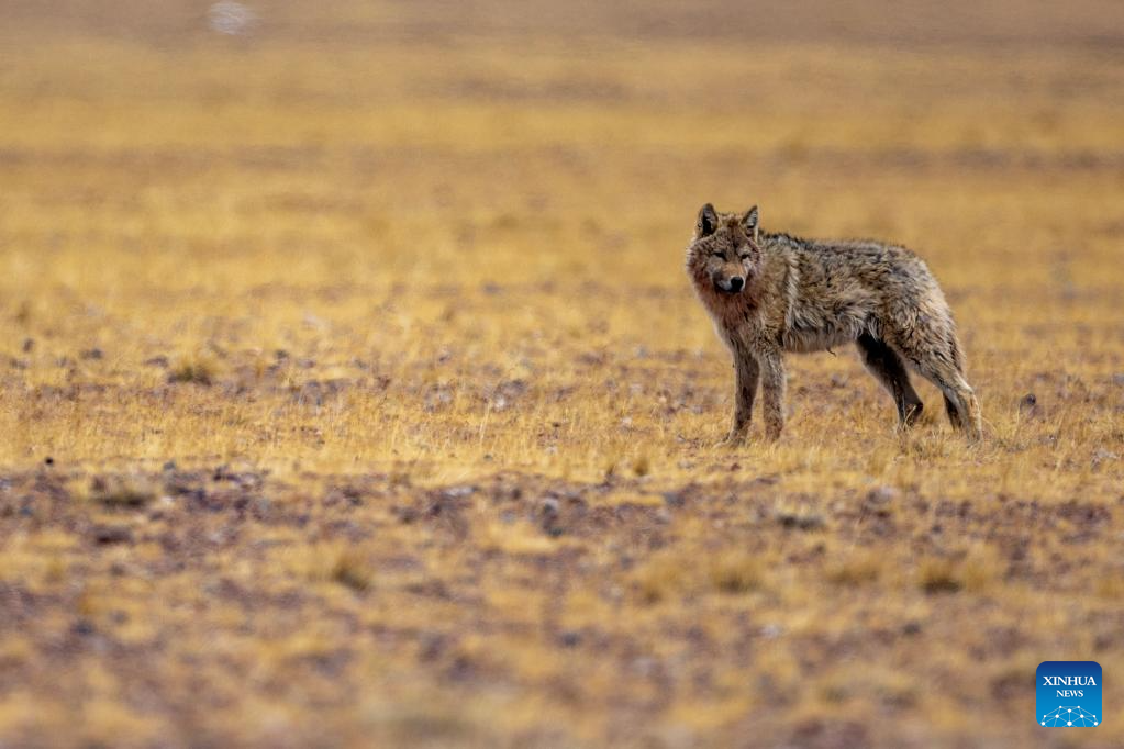 This photo taken on May 10, 2024 shows a wolf at the Changtang National Nature Reserve in Nyima County of Nagqu City, southwest China's Xizang Autonomous Region. Dubbed the "paradise of wild animals," Changtang National Nature Reserve is home to over 30 kinds of wild animals listed on China's national-level protection catalogue, including Tibetan antelopes and wild yaks. (Xinhua/Jiang Fan)