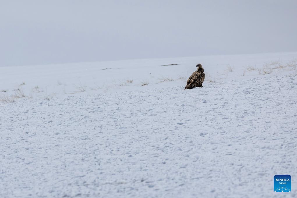 This photo taken on May 12, 2024 shows a Himalayan vulture at the Changtang National Nature Reserve in Nyima County of Nagqu City, southwest China's Xizang Autonomous Region. Dubbed the "paradise of wild animals," Changtang National Nature Reserve is home to over 30 kinds of wild animals listed on China's national-level protection catalogue, including Tibetan antelopes and wild yaks. (Xinhua/Jiang Fan)