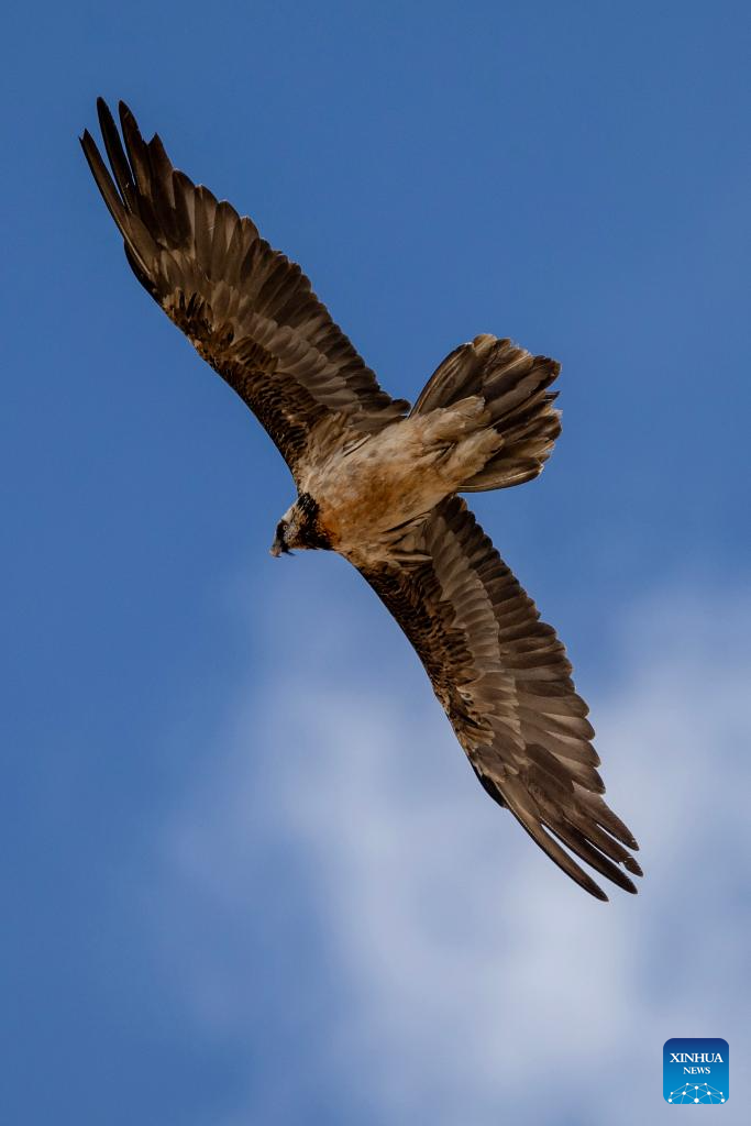 This photo taken on May 10, 2024 shows a bearded vulture at the Changtang National Nature Reserve in Nyima County of Nagqu City, southwest China's Xizang Autonomous Region. Dubbed the "paradise of wild animals," Changtang National Nature Reserve is home to over 30 kinds of wild animals listed on China's national-level protection catalogue, including Tibetan antelopes and wild yaks. (Xinhua/Jiang Fan)