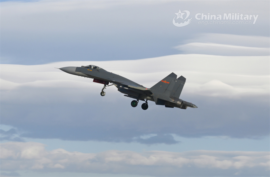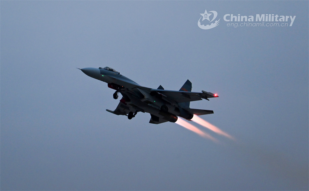 A fighter jet attached to an aviation brigade with the air force under the PLA Western Theater Command soars into the sky during a flight training exercise in early April, 2024. (eng.chinamil.com.cn/Photo by Yu Zeqi)