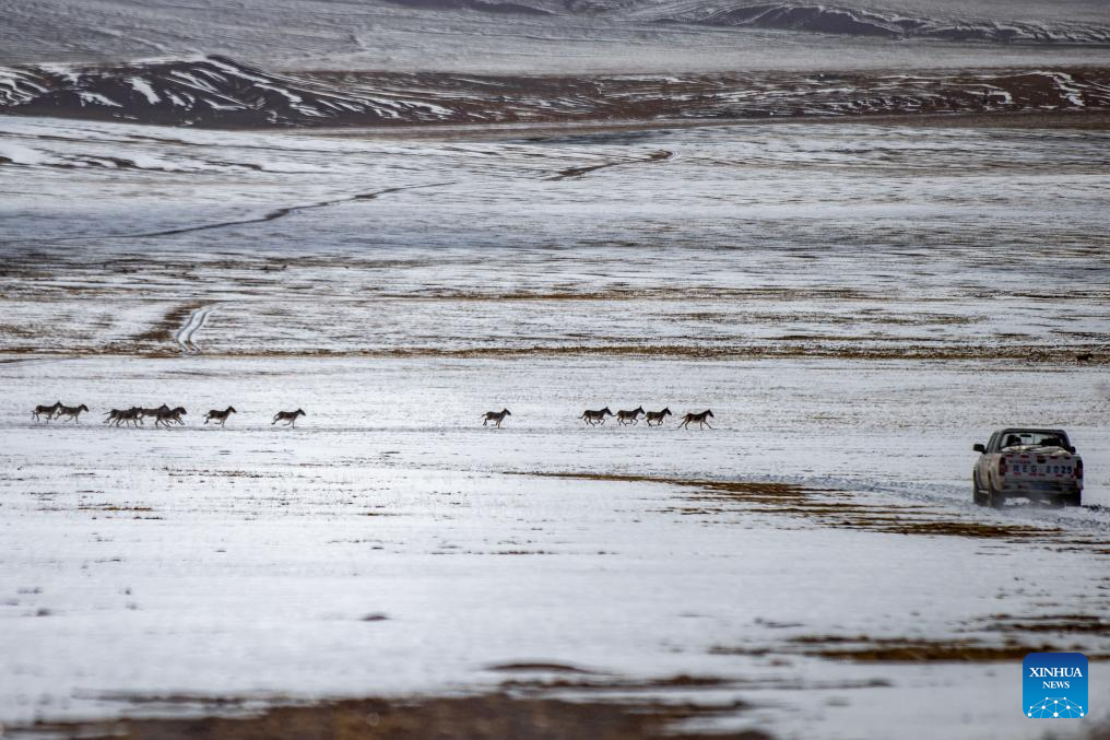 A herd of Tibetan wild donkeys run past a ranger vehicle at the Changtang National Nature Reserve in Nyima County of southwest China's Xizang Autonomous Region, May 9, 2024. (Xinhua/Jiang Fan)