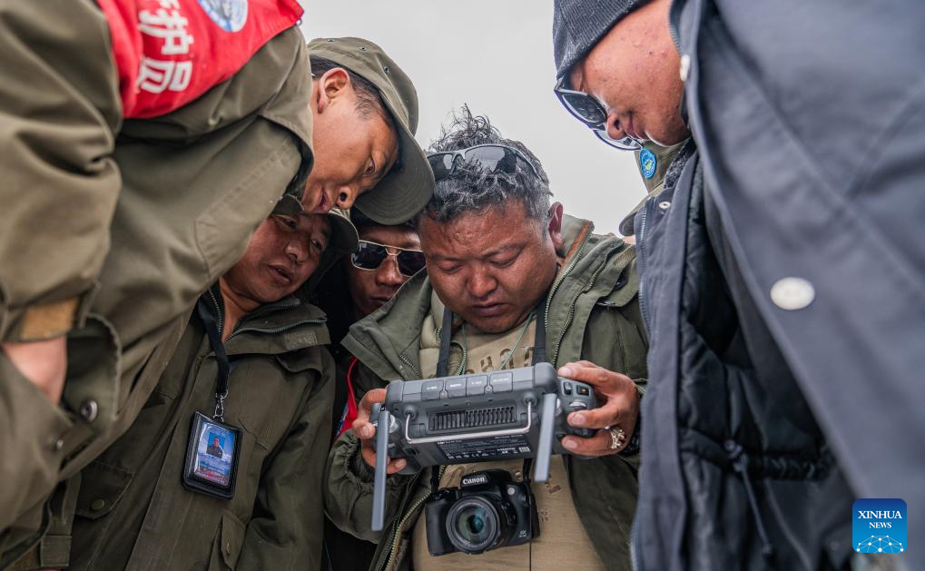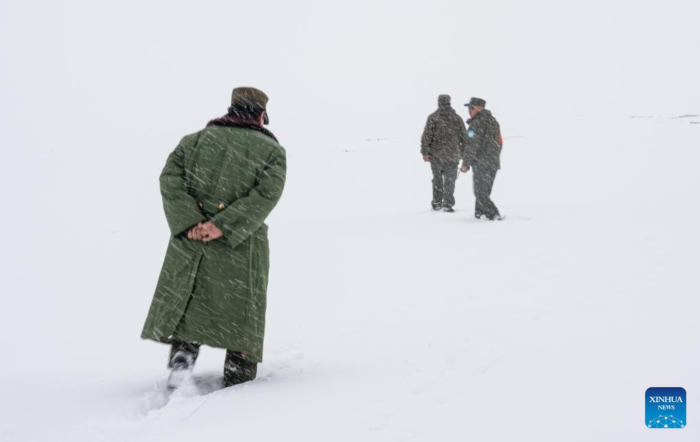 Kelsang Lhundrup (2nd R), head of Norbu Yugyel wildlife protection station, and his colleagues observe the migration of Tibetan antelopes via a drone camera amid snowfall at the Changtang National Nature Reserve in Nyima County of southwest China's Xizang Autonomous Region, May 10, 2024. (Xinhua/Tenzin Nyida)