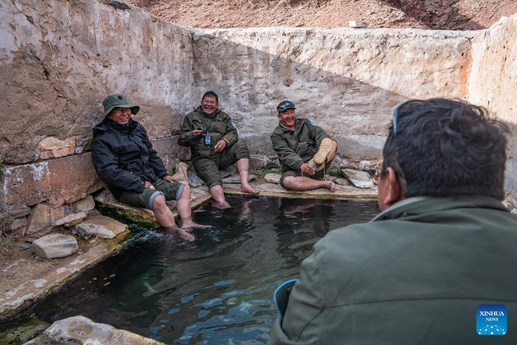 Rangers take a rest at a deserted hot spring pool at the Changtang National Nature Reserve in Nyima County of southwest China's Xizang Autonomous Region, May 8, 2024. (Xinhua/Tenzin Nyida)