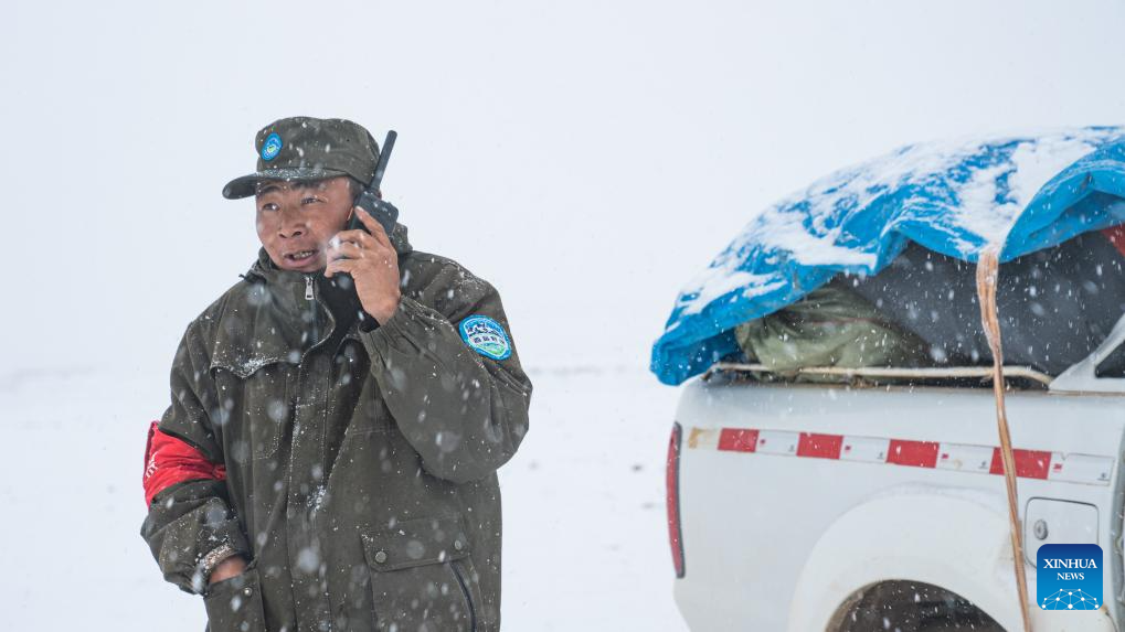 A ranger communicates via satellite phone amid snowfall at the Changtang National Nature Reserve in Nyima County of southwest China's Xizang Autonomous Region, May 7, 2024. (Xinhua/Tenzin Nyida)