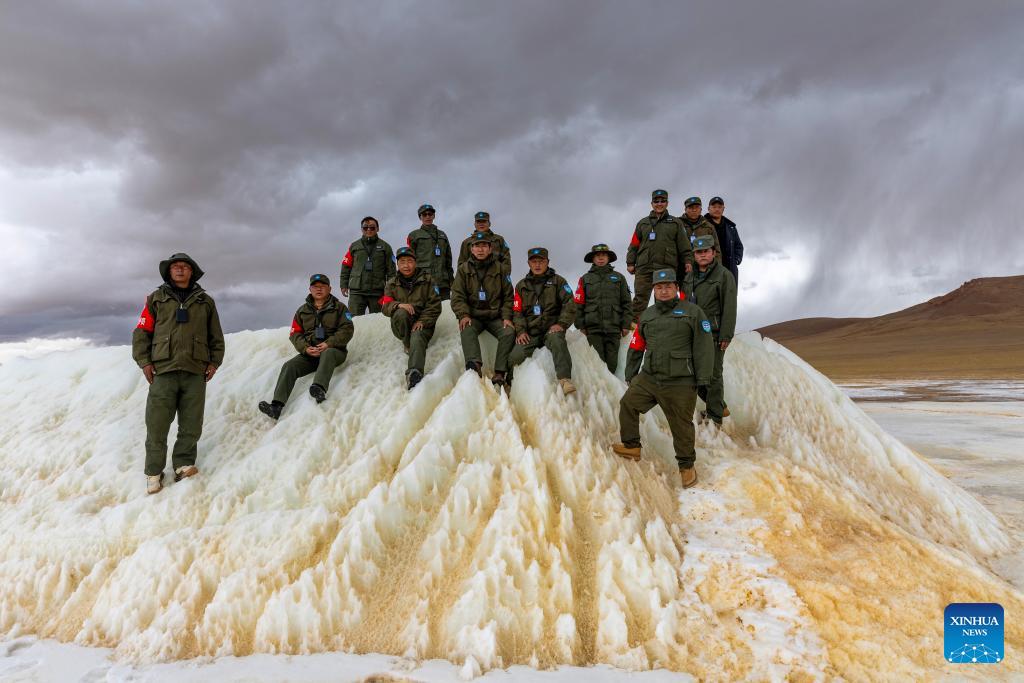Rangers pose for a group photo on a pile of snow and ice at the Changtang National Nature Reserve in Nyima County of southwest China's Xizang Autonomous Region, May 7, 2024. (Xinhua/Jiang Fan)?