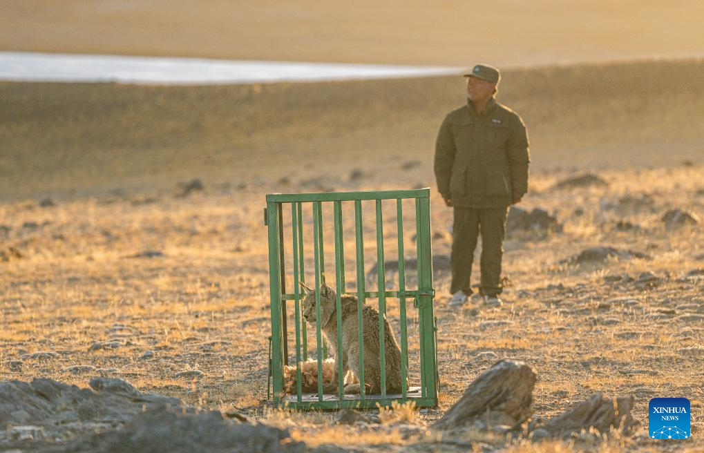A ranger prepares to release a lynx into the wild at the Changtang National Nature Reserve in Nyima County of southwest China's Xizang Autonomous Region, May 12, 2024. (Xinhua/Tenzin Nyida)