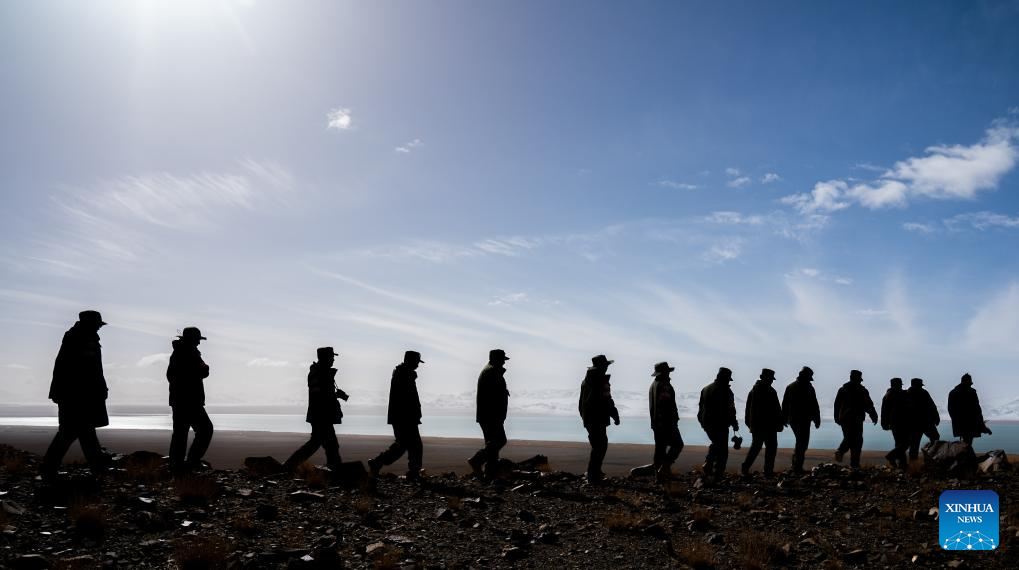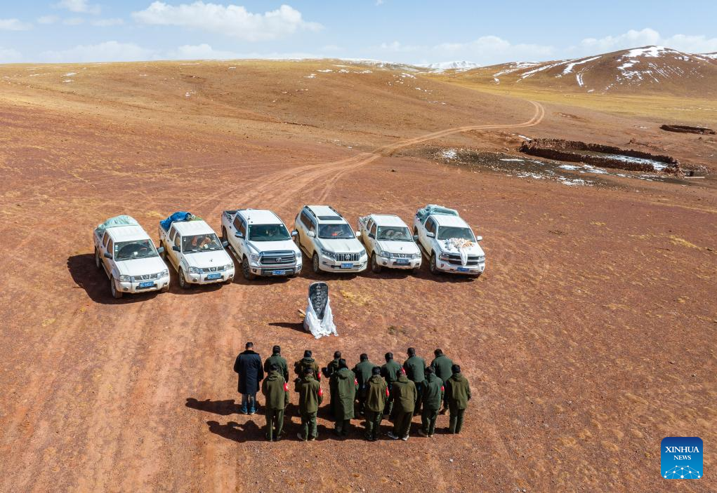 An aerial drone photo shows rangers paying tribute in front of the monument of Norbu Yugyel, a heroic ranger who died in a fight against poaching in 2002, at the Changtang National Nature Reserve in Nyima County of southwest China's Xizang Autonomous Region, May 10, 2024. (Xinhua/Jiang Fan)