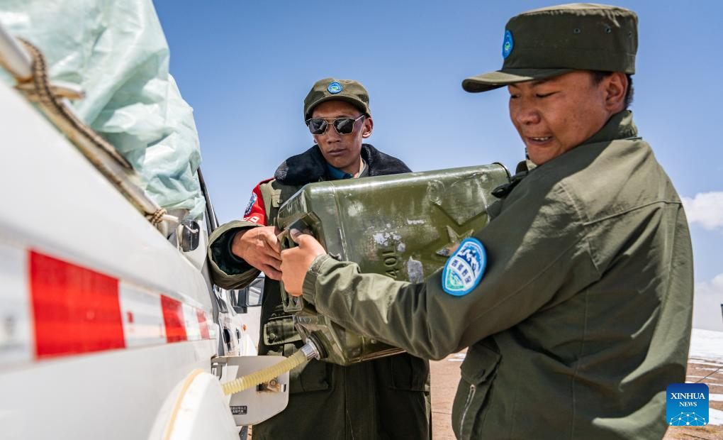 Rangers refuel their vehicle during patrol at the Changtang National Nature Reserve in Nyima County of southwest China's Xizang Autonomous Region, May 9, 2024. (Xinhua/Tenzin Nyida)