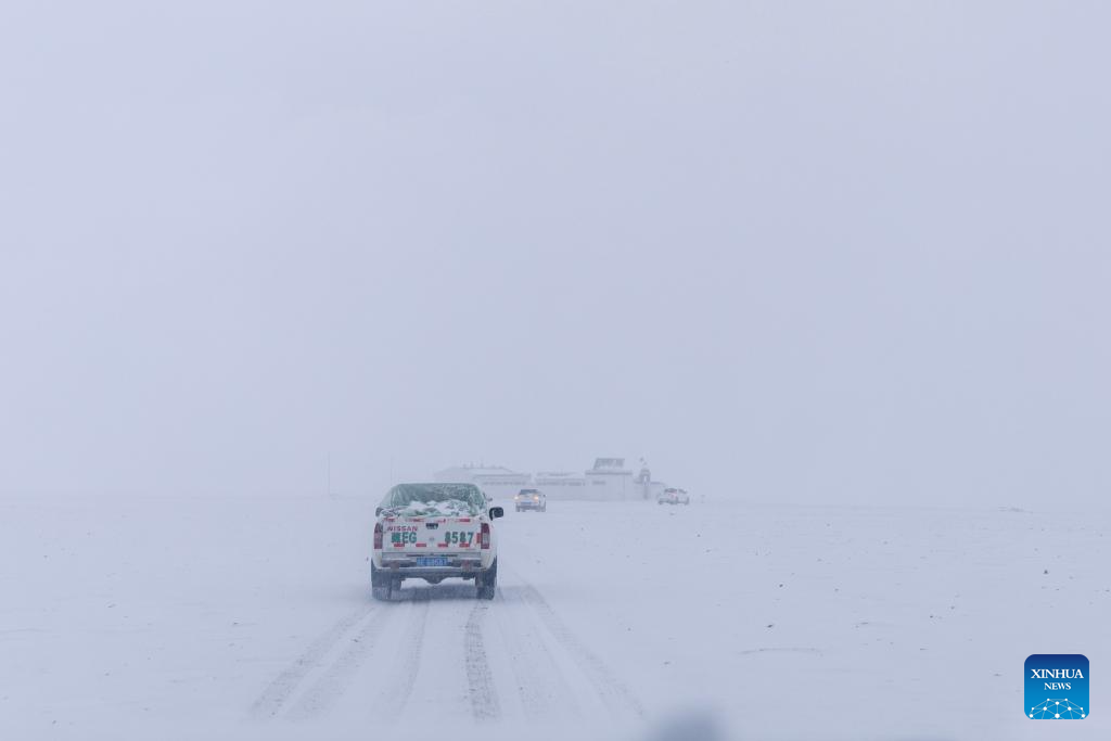 Rangers walk amid snowfall to check road conditions at the Changtang National Nature Reserve in Nyima County of southwest China's Xizang Autonomous Region, May 8, 2024. (Xinhua/Tenzin Nyida)