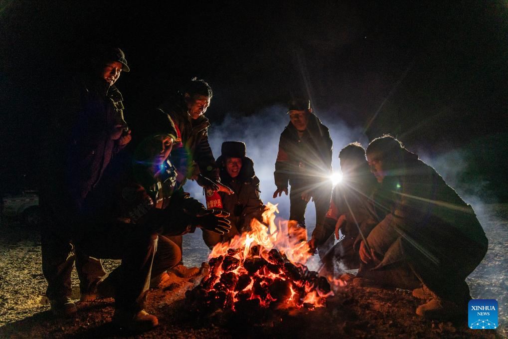 Rangers keep warm by burning dung of wild yak at a camp at the Changtang National Nature Reserve in Nyima County of southwest China's Xizang Autonomous Region, May 10, 2024. (Xinhua/Tenzin Nyida)