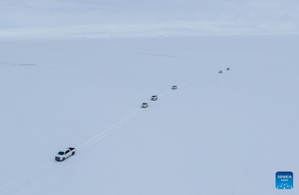 An aerial drone photo taken on May 8, 2024 shows ranger vehicles patrolling the Changtang National Nature Reserve in Nyima County of southwest China's Xizang Autonomous Region. (Xinhua/Tenzin Nyida)