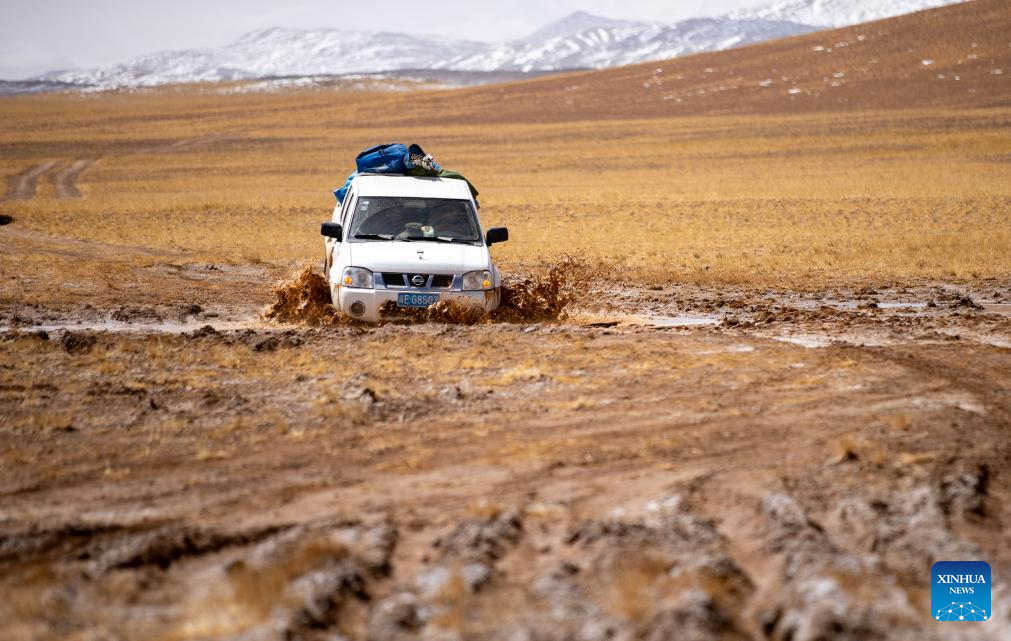 A ranger vehicle ploughs through muddy roads during patrol at the Changtang National Nature Reserve in Nyima County of southwest China's Xizang Autonomous Region, May 10, 2024. (Xinhua/Jiang Fan)