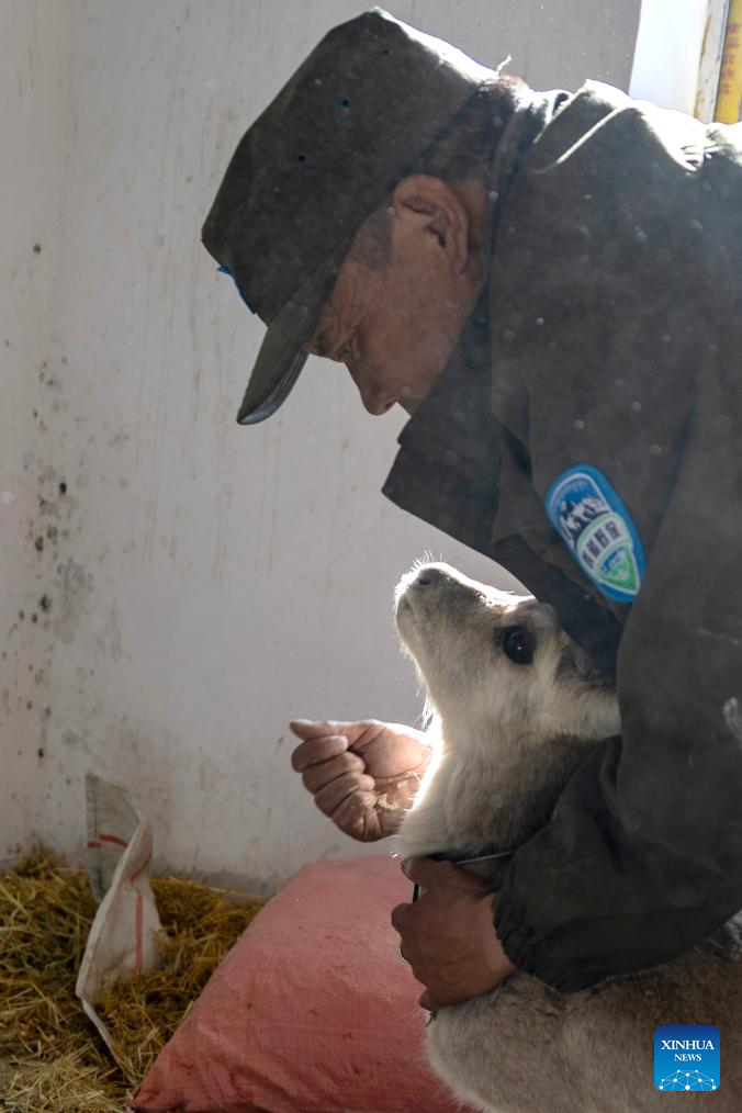 A ranger feeds a rescued Tibetan gazelle at Norbu Yugyel wildlife protection station at the Changtang National Nature Reserve in Nyima County of southwest China's Xizang Autonomous Region, May 7, 2024. (Xinhua/Jiang Fan)