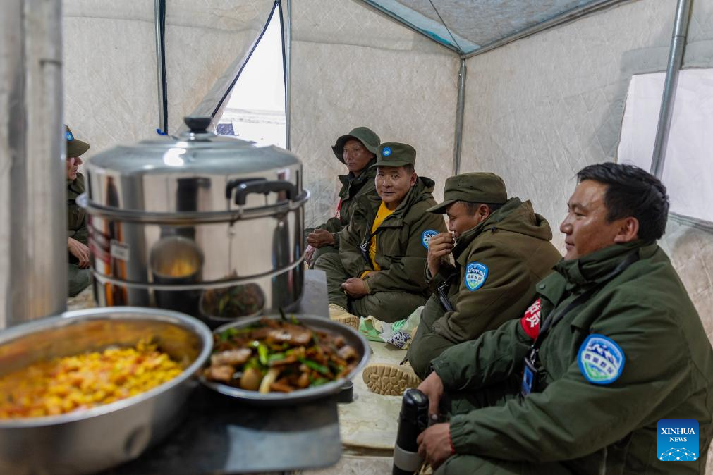 Rangers are about to have a meal in a tent at the Changtang National Nature Reserve in Nyima County of southwest China's Xizang Autonomous Region, May 7, 2024. (Xinhua/Jiang Fan)
