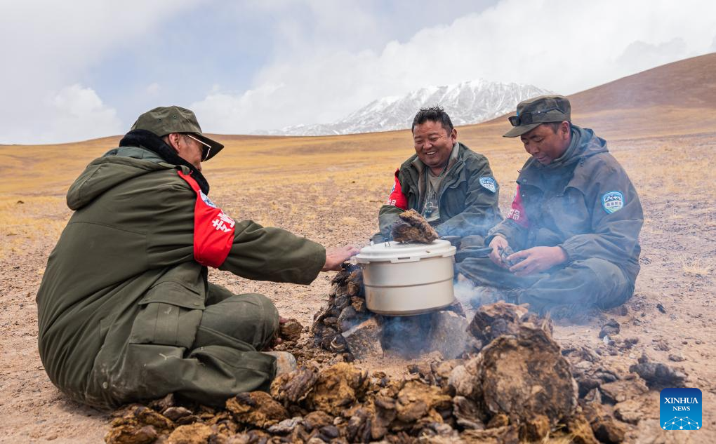 Rangers cook with fire of dry dung during patrol at the Changtang National Nature Reserve in Nyima County of southwest China's Xizang Autonomous Region, May 10, 2024. (Xinhua/Tenzin Nyida)