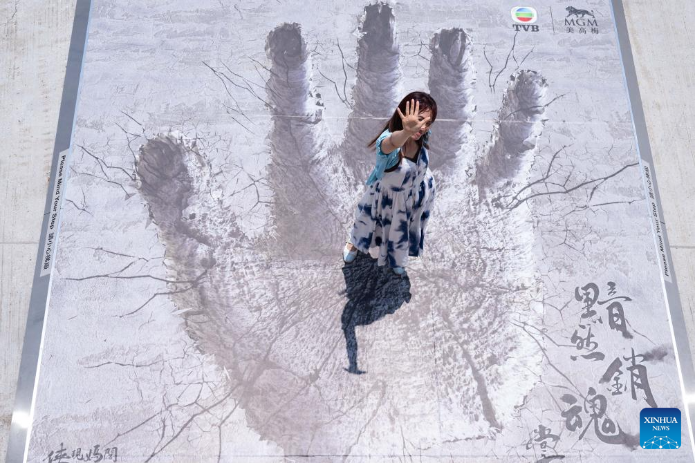 A visitor poses for photos at the Jin Yong Wuxia Drama Costumes and Weapons Exhibition held in Macao, south China, May 14, 2024. This exhibition relives the iconic scenes from eight renowned Wuxia TV dramas of the late Chinese martial arts novelist Louis Cha Leung-yung, more widely known by his pen name Jin Yong. (Xinhua/Cheong Kam Ka)