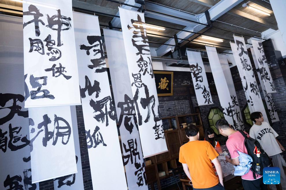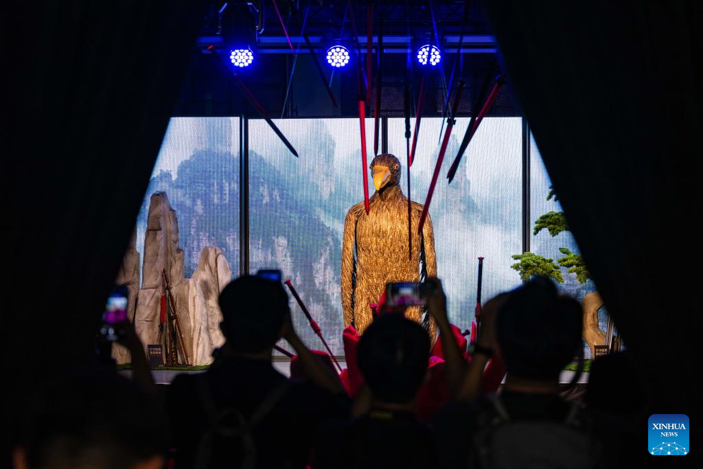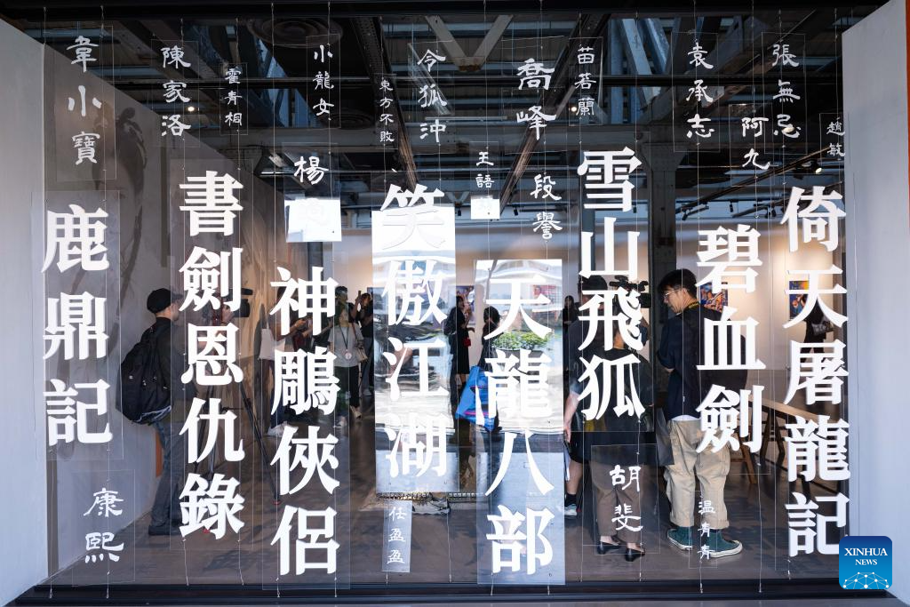 Visitors watch exhibits at the Jin Yong Wuxia Drama Costumes and Weapons Exhibition held in Macao, south China, May 14, 2024. This exhibition relives the iconic scenes from eight renowned Wuxia TV dramas of the late Chinese martial arts novelist Louis Cha Leung-yung, more widely known by his pen name Jin Yong. (Xinhua/Cheong Kam Ka)