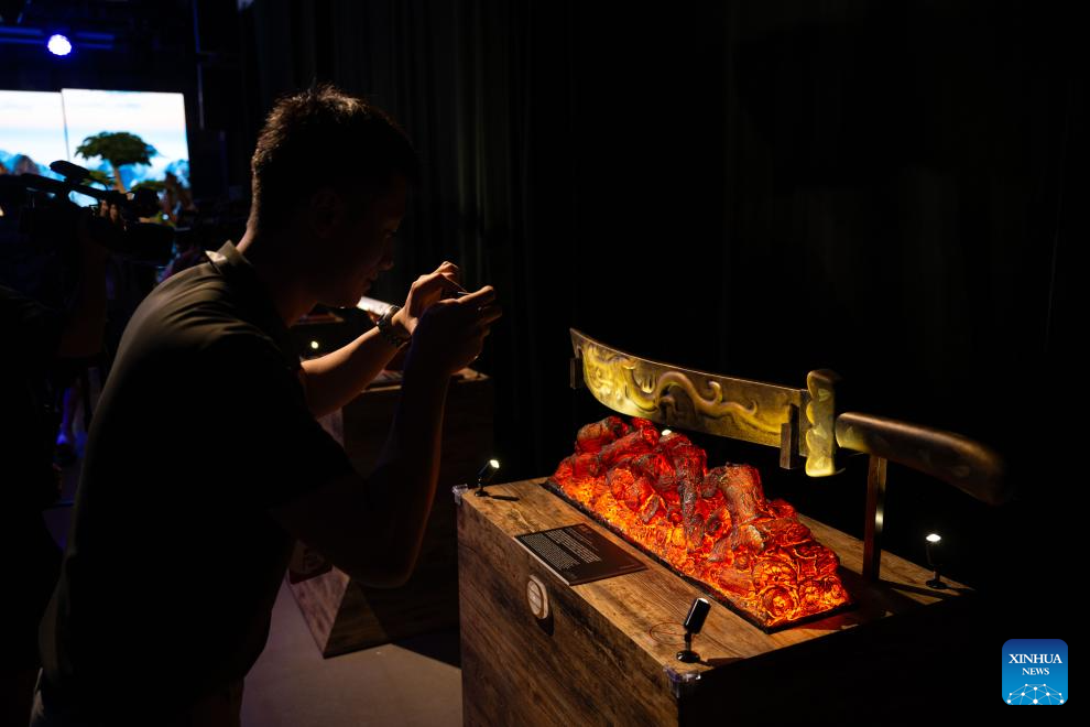 A visitor takes photos of an exhibit at the Jin Yong Wuxia Drama Costumes and Weapons Exhibition held in Macao, south China, May 14, 2024. This exhibition relives the iconic scenes from eight renowned Wuxia TV dramas of the late Chinese martial arts novelist Louis Cha Leung-yung, more widely known by his pen name Jin Yong. (Xinhua/Cheong Kam Ka)