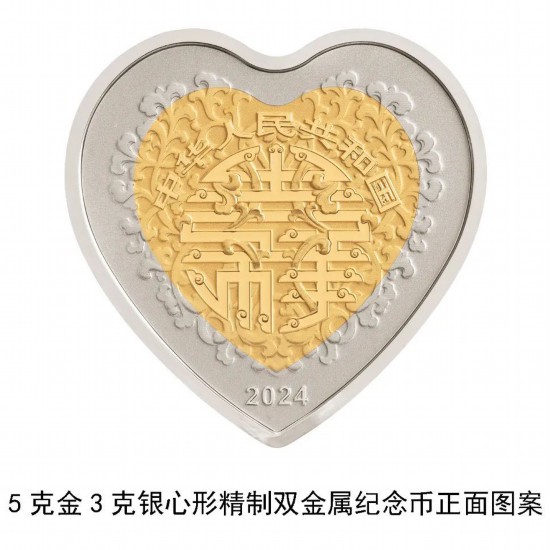 The reverse side of the heart-shaped bimetallic coin that will contain 5 grams of gold and 3 grams of silver will feature a decorative heart-shaped combination design and will display the Chinese characters "Xin Xin Xiang Yin," as well as the face value of the coin.