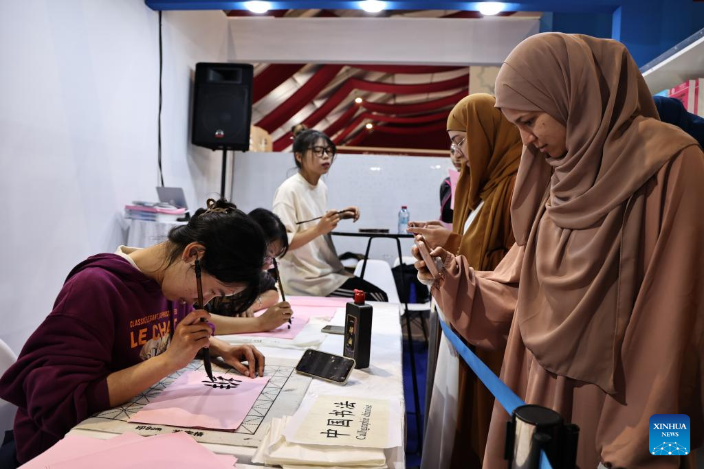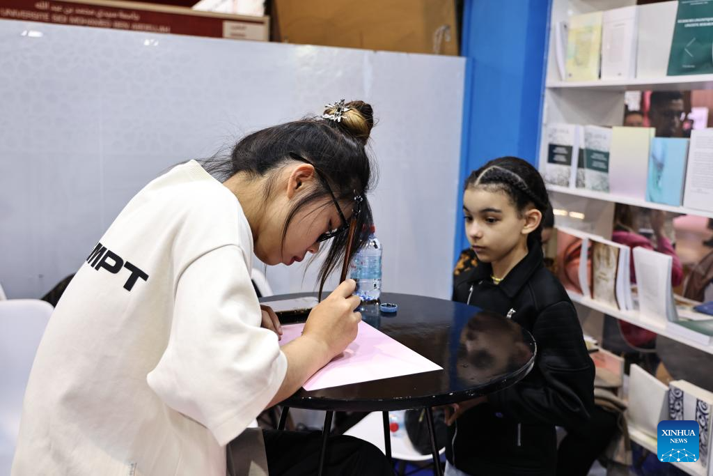 A young girl watches a student from the Confucius Institute at the Mohammed V University writing her name in Chinese calligraphy during the 29th edition of the International Book and Publishing Fair in Rabat, Morocco, May 14, 2024. Chinese calligraphy has charmed many Moroccan people in cultural events held here on Tuesday. (Xinhua/Huo Jing)
