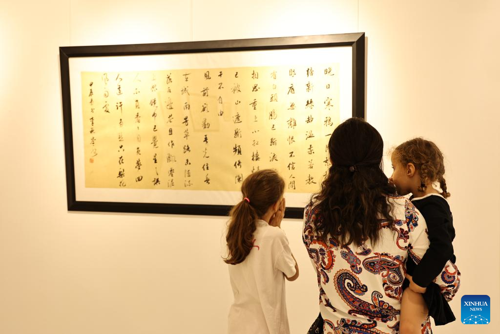 Visitors view an exhibit during a Chinese calligraphy exhibition held in Rabat, Morocco, May 14, 2024. Chinese calligraphy has charmed many Moroccan people in cultural events held here on Tuesday. (Xinhua/Huo Jing)