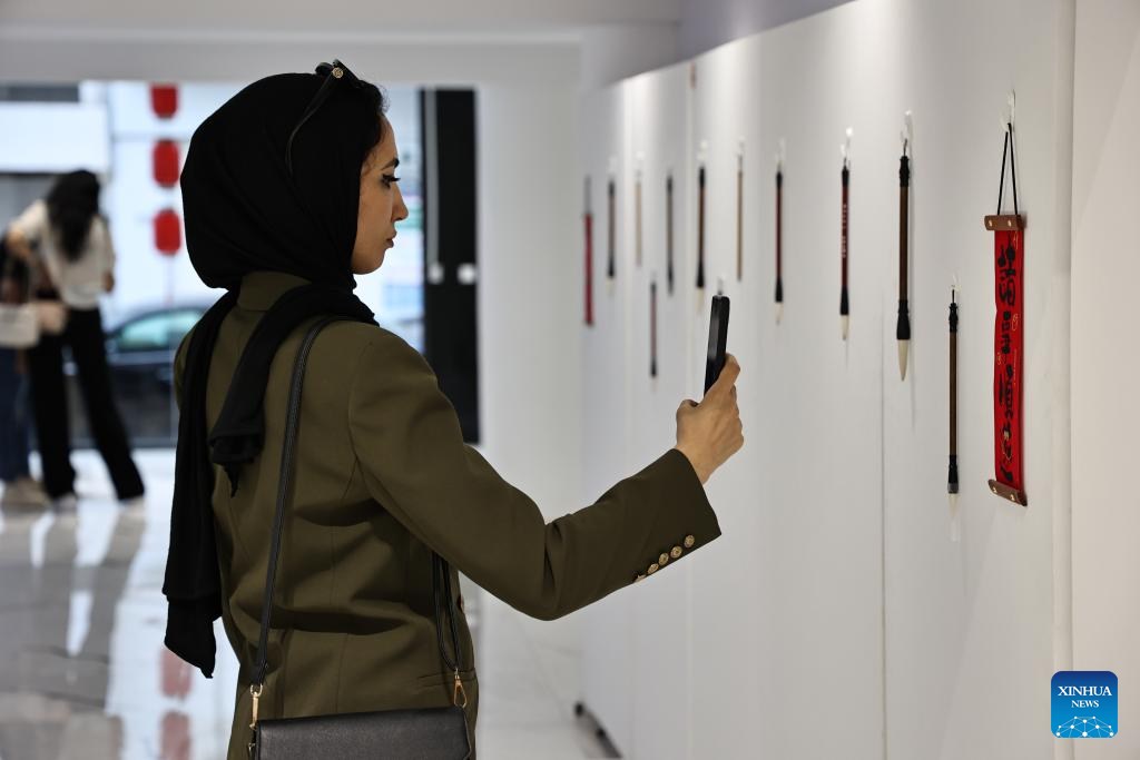 A visitor takes photos of exhibits during a Chinese calligraphy exhibition held in Rabat, Morocco, May 14, 2024. Chinese calligraphy has charmed many Moroccan people at cultural events held here on Tuesday. (Xinhua/Huo Jing)