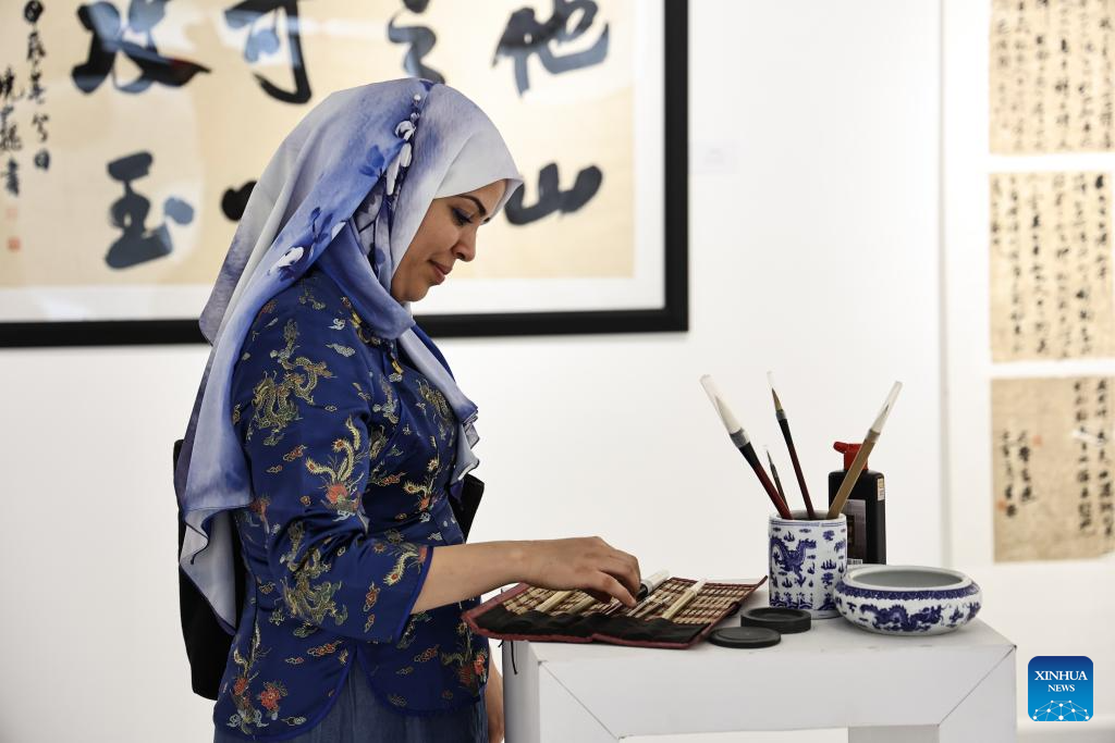 A woman takes a close look at traditional Chinese writing tools during a Chinese calligraphy exhibition held in Rabat, Morocco, May 14, 2024. Chinese calligraphy has charmed many Moroccan people in cultural events held here on Tuesday. (Xinhua/Huo Jing)