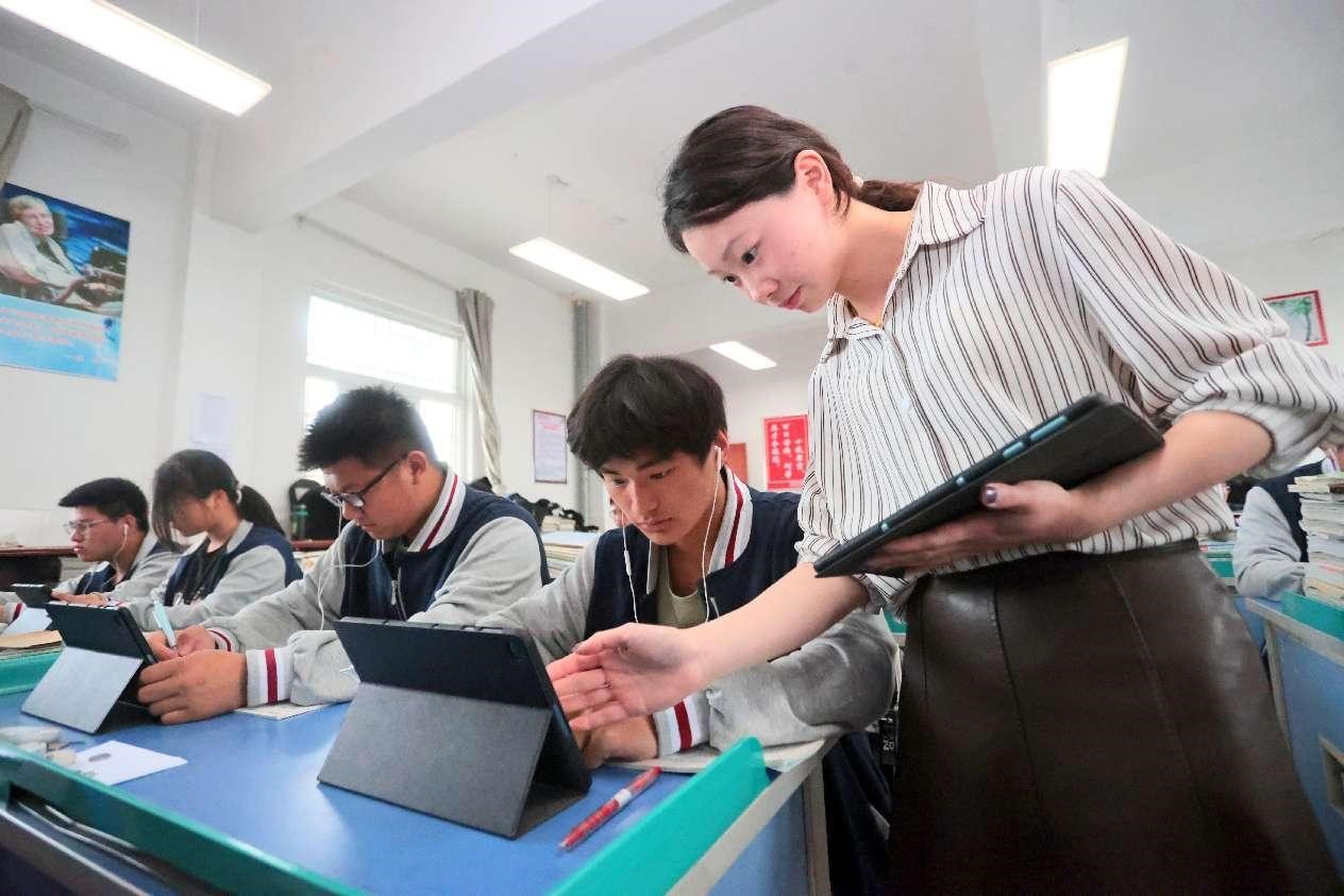 A teacher instructs students to learn with an AI-enabled system at a middle school in Huai'an, east China's Jiangsu province. (People's Daily Online/Wang Hao)
