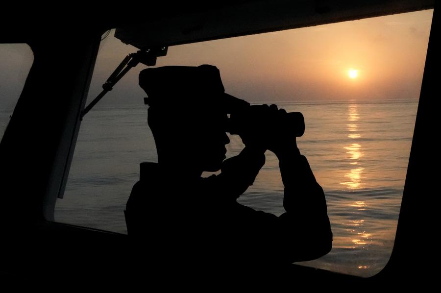 A law enforcer observes on the vessel "China Coast Guard (CCG) 3502" in the South China Sea, May 12, 2024. (Xinhua/Wang Yuguo)