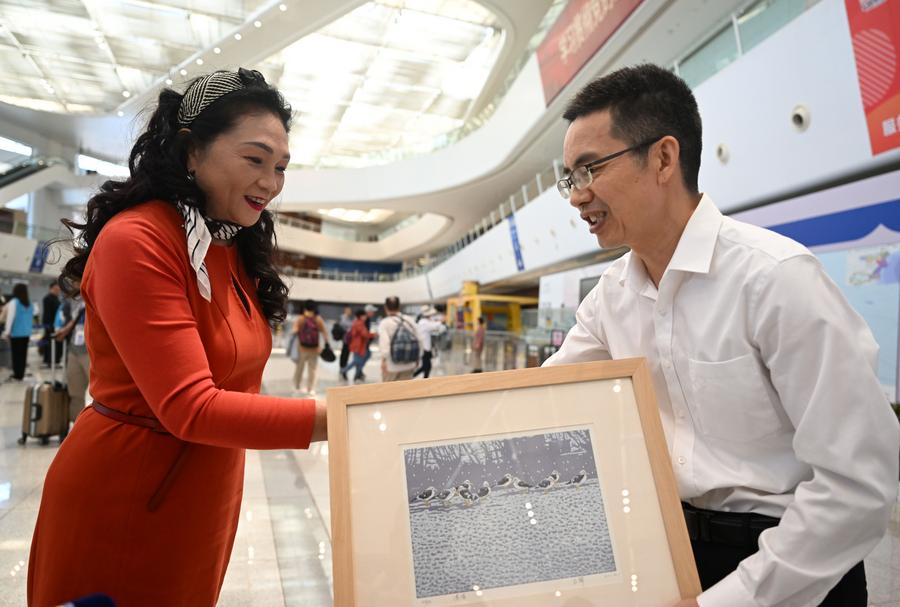 A staff member (R) of Tianjin International Cruise Home Port presents a souvenir to the home port's 100,000th international cruise passenger in 2024 (L) before the latter embarks on a cruise ship in north China's Tianjin Municipality, May 15, 2024. (Xinhua/Zhao Zishuo)