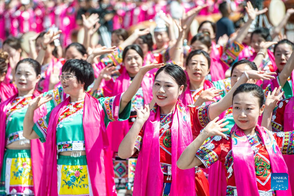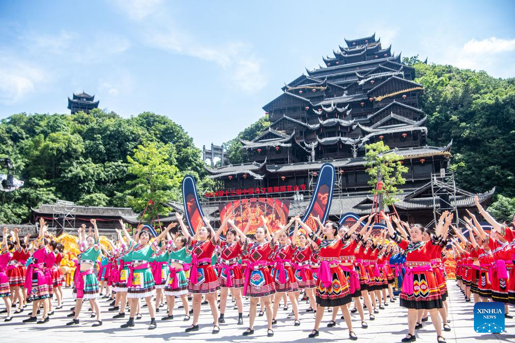People from the Miao ethnic group celebrate the Caihuashan festival in Chiyou Jiuli Town of Pengshui Miao-Tujia Autonomous County, southwest China's Chongqing, May 15, 2024. The Caihuashan festival is a traditional Miao festival which derives from courtship rituals, where young people meet and make acquaintance by singing and dancing together. The festival celebrations have become increasingly popular in recent years with the development of local tourism and the promotion of Miao ethnic cultures. (Xinhua/Tang Yi)