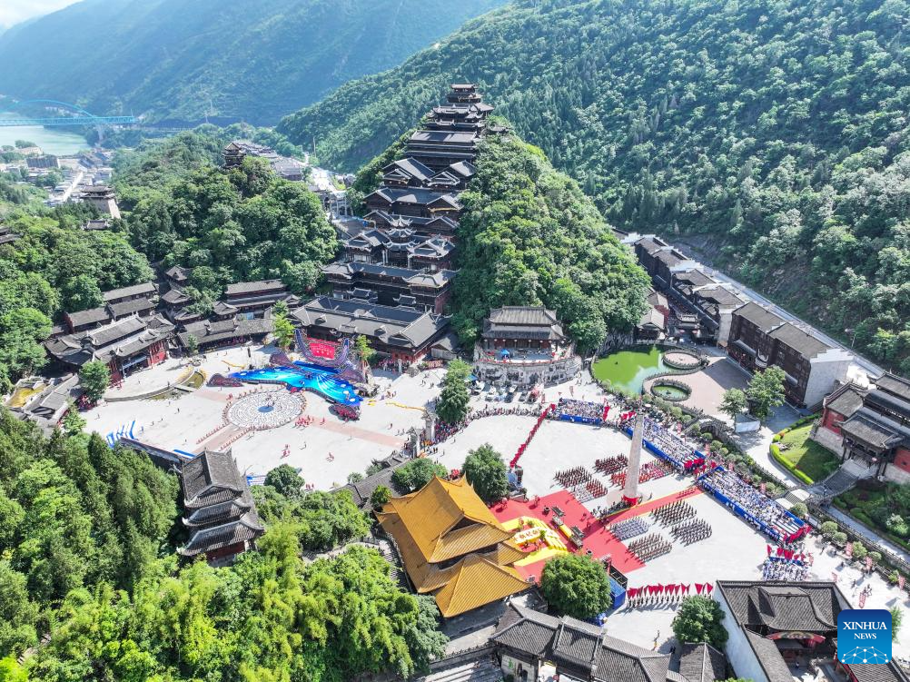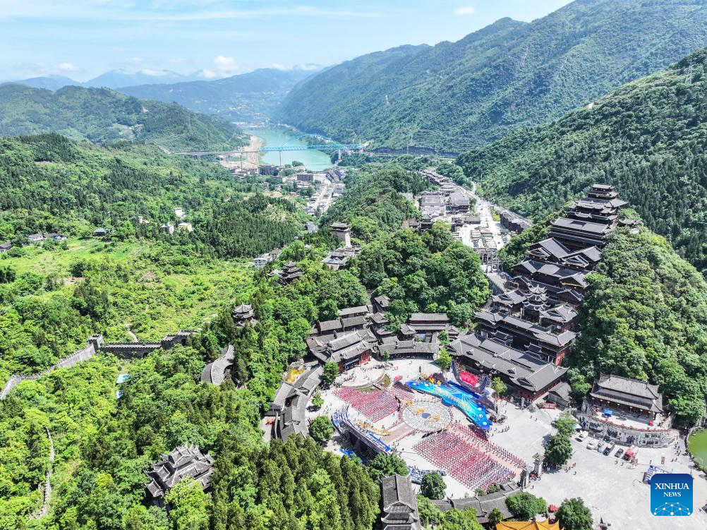 An aerial drone photo taken on May 15, 2024 shows people from the Miao ethnic group celebrating the Caihuashan festival in Chiyou Jiuli Town of Pengshui Miao-Tujia Autonomous County, southwest China's Chongqing. The Caihuashan festival is a traditional Miao festival which derives from courtship rituals, where young people meet and make acquaintance by singing and dancing together. The festival celebrations have become increasingly popular in recent years with the development of local tourism and the promotion of Miao ethnic cultures. (Xinhua/Tang Yi)