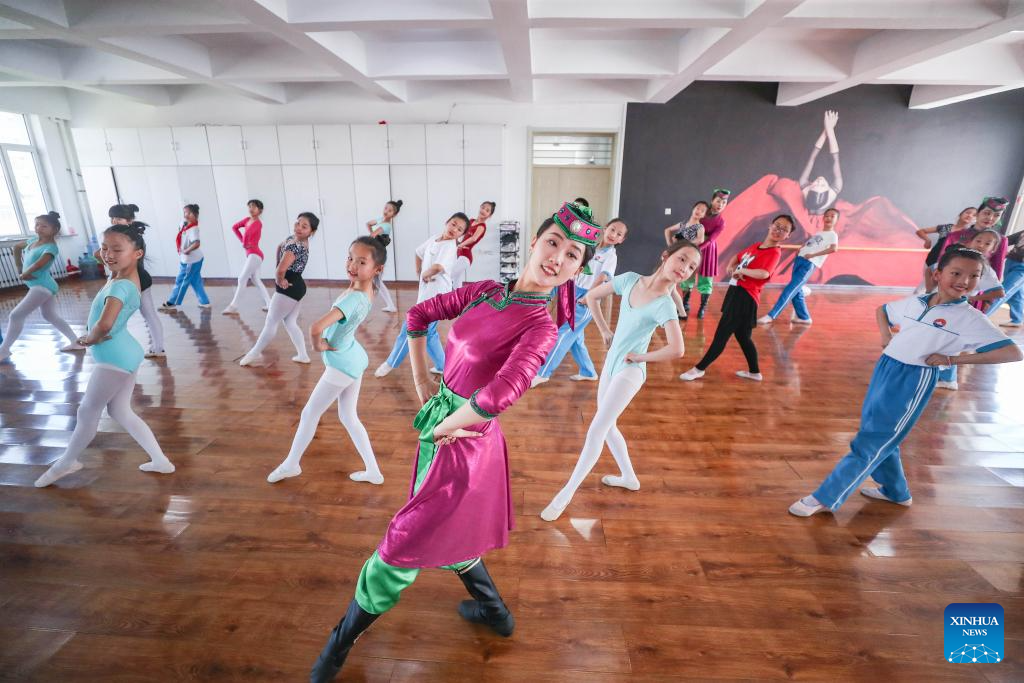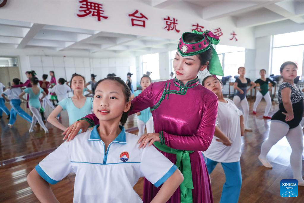 A dancer from a local cultural tourism service center teaches students Mongolian dance at a primary school in Fuxin Mongolian Autonomous County, northeast China's Liaoning Province, May 15, 2024. Fuxin has stepped up efforts in protection and inheritance of traditional Mongolian ethnic culture by offering students various lessons such as horse-head fiddle and Mongolian dance, etc. to help bring new vitality to traditional ethnic culture. (Xinhua/Long Lei)