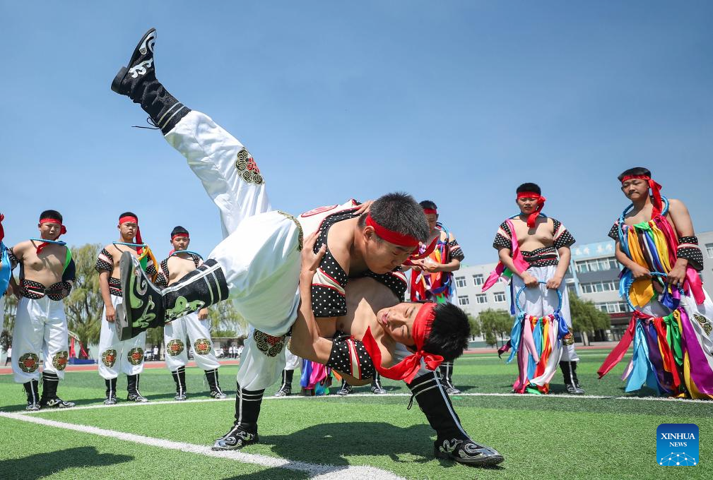 Students practice Mongolian wrestling at a middle school in Fuxin Mongolian Autonomous County, northeast China's Liaoning Province, May 15, 2024. Fuxin has stepped up efforts in protection and inheritance of traditional Mongolian ethnic culture by offering students various lessons such as horse-head fiddle and Mongolian dance, etc. to help bring new vitality to traditional ethnic culture. (Xinhua/Long Lei)