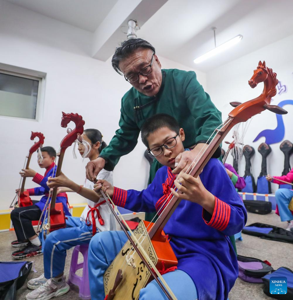 Teacher Wu Fulin teaches a student to practice horse-head fiddle at a primary school in Fuxin Mongolian Autonomous County, northeast China's Liaoning Province, May 15, 2024. Fuxin has stepped up efforts in protection and inheritance of traditional Mongolian ethnic culture by offering students various lessons such as horse-head fiddle and Mongolian dance, etc. to help bring new vitality to traditional ethnic culture. (Xinhua/Long Lei)