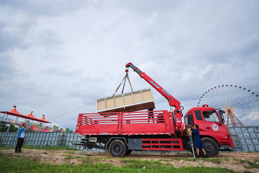 The transport box customized for the short-finned pilot whale "Haitang" is hoisted near the rescue pool of Sanya Haichang Animal Conservation Center in Sanya, south China's Hainan Province, May 15, 2024. (Xinhua/Zhang Liyun)