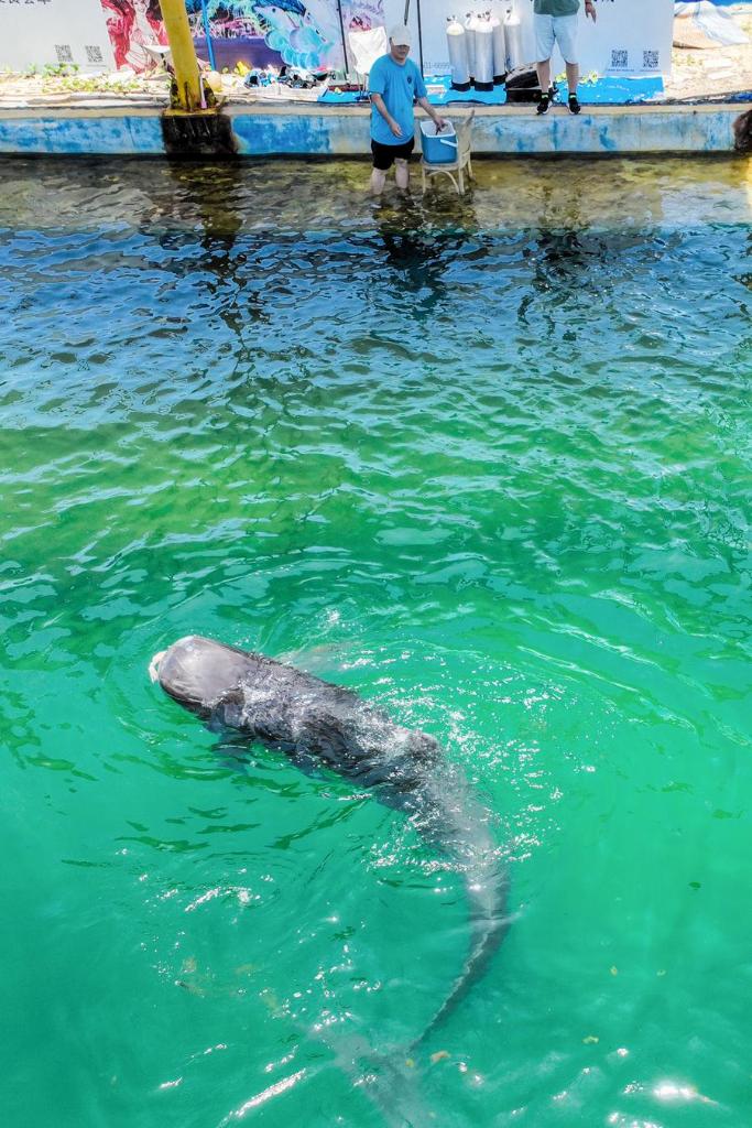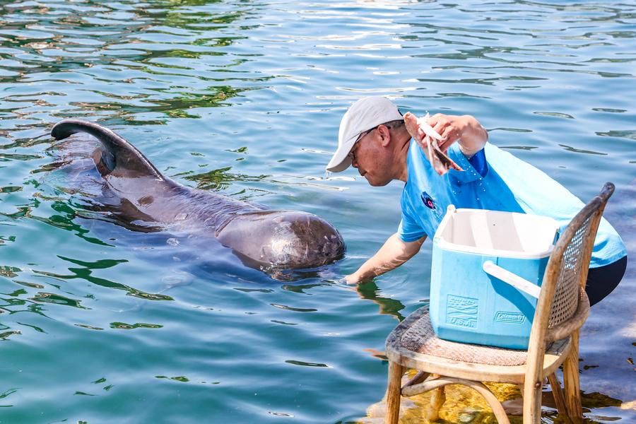 A worker from Sanya Haichang Animal Conservation Center feeds the short-finned pilot whale "Haitang" in Sanya, south China's Hainan Province, May 15, 2024. (Xinhua/Zhang Liyun)