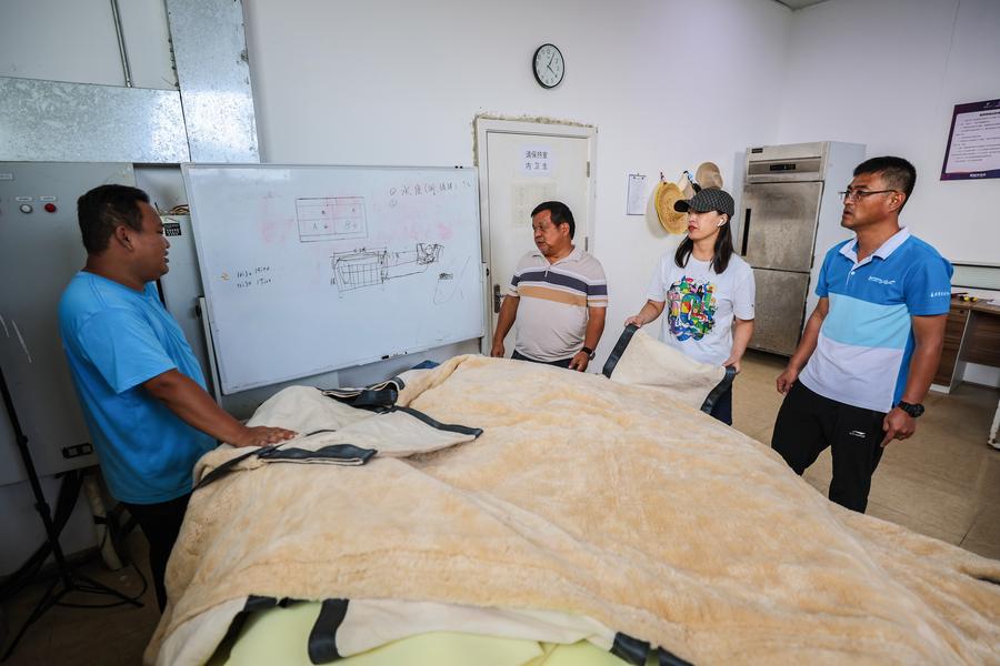 Workers from Blue Ribbon Ocean Conservation Association and Sanya Haichang Animal Conservation Center discuss the release plan of the short-finned pilot whale "Haitang" in Sanya, south China's Hainan Province, May 15, 2024. (Xinhua/Zhang Liyun)
