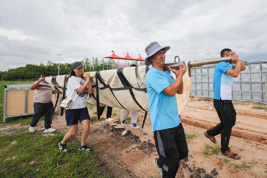 Workers from Blue Ribbon Ocean Conservation Association and Sanya Haichang Animal Conservation Center carry a stretcher used to transport the short-finned pilot whale "Haitang" in Sanya, south China's Hainan Province, May 15, 2024. (Xinhua/Zhang Liyun)