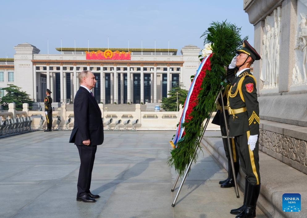 Russian President Vladimir Putin lays a wreath at the Monument to the People's Heroes on the Tian'anmen Square in Beijing, capital of China, May 16, 2024. (Xinhua/Ding Lin)