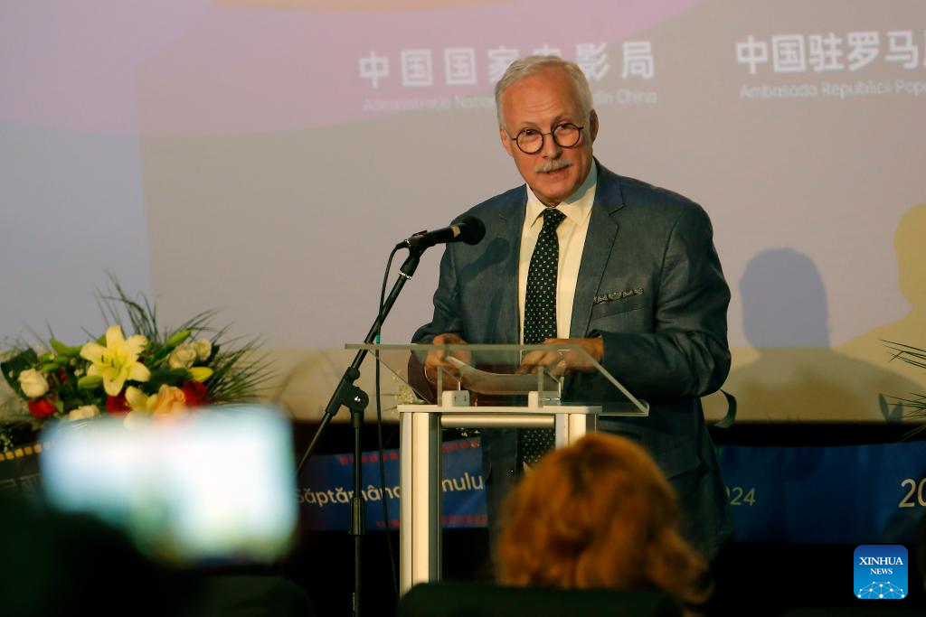 Dan Krizbai, deputy director of Romanian National Film Archives, speaks during the opening ceremony of the 2024 Chinese Film Week in Bucharest, Romania, May 15, 2024. (Photo by Cristian Cristel/Xinhua)