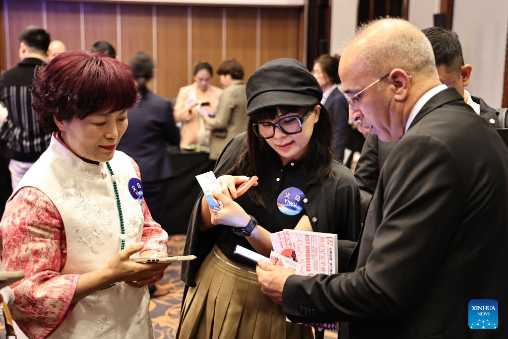 Members of a Chinese business delegation from Yiwu, east China's Zhejiang Province, exchange contact information with their Moroccan counterparts during a business matchmaking event in Casablanca, Morocco, May 15, 2024. (Xinhua/Huo Jing)