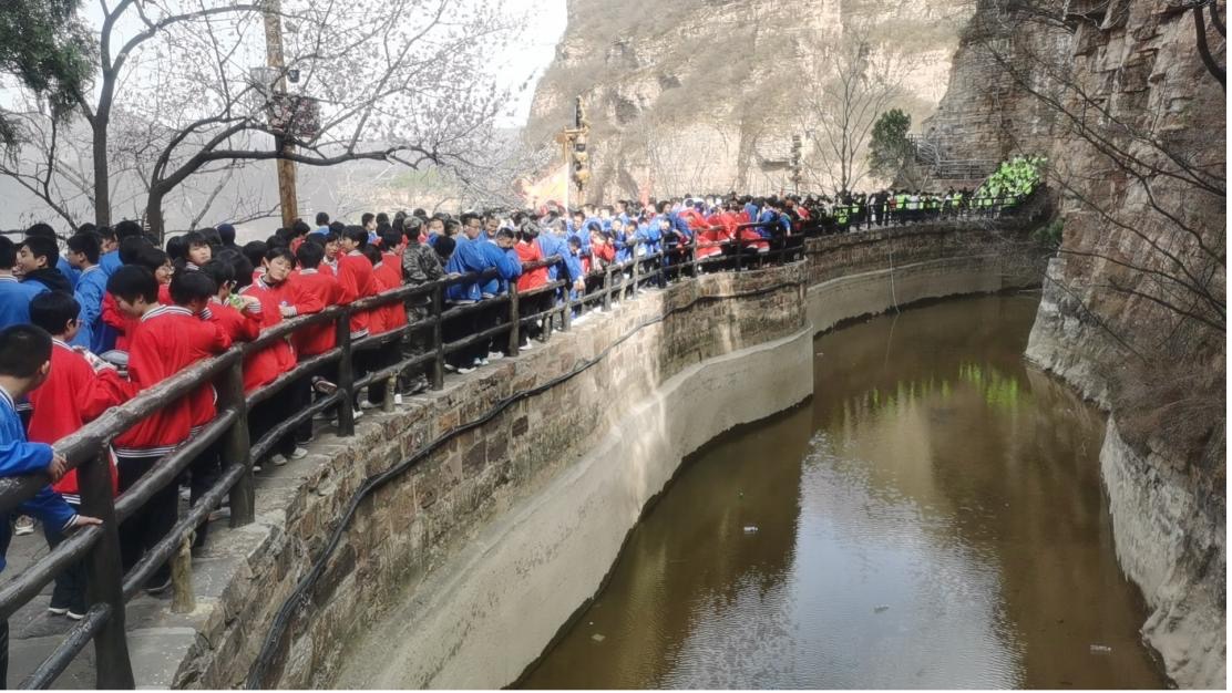 Photo taken on March 28, 2024 shows students visiting Red Flag Canal in Linzhou, Anyang, central China's Henan Province. (People's Daily Online/Zhang Kaiwei)