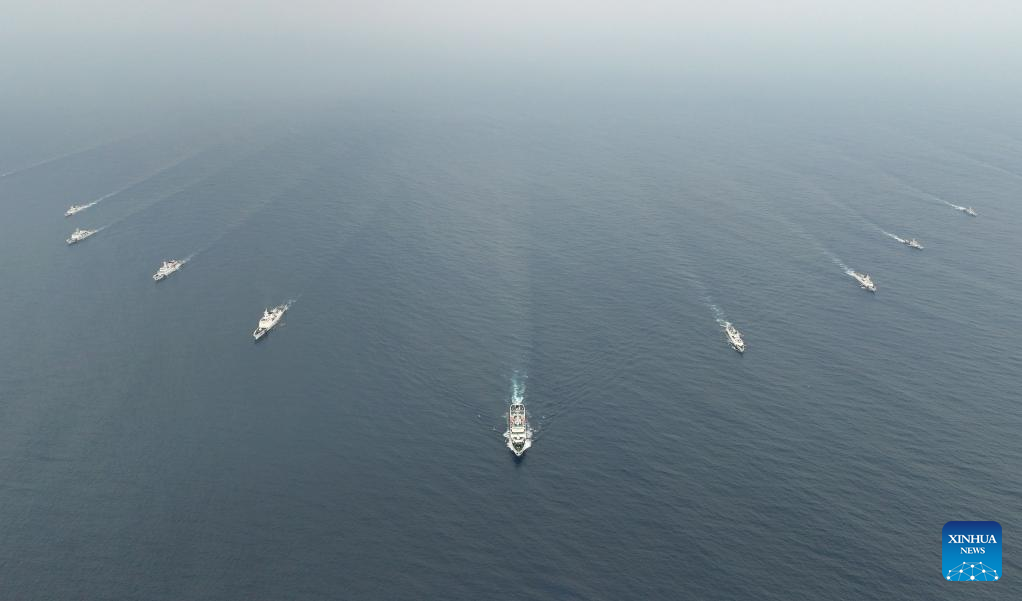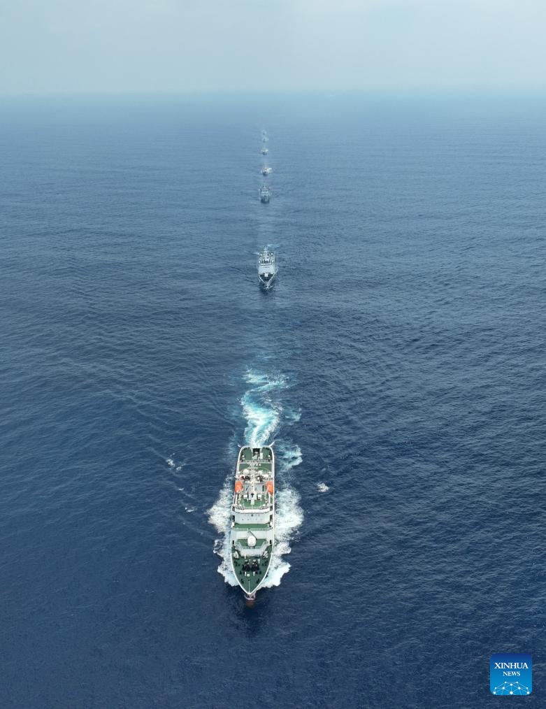An aerial drone photo taken on May 17, 2024 shows the China Coast Guard (CCG) 3502 fleet conducting formation training in waters adjacent to China's Huangyan Dao. (Xinhua/Wang Yuguo)