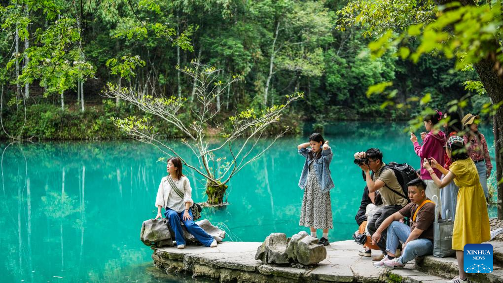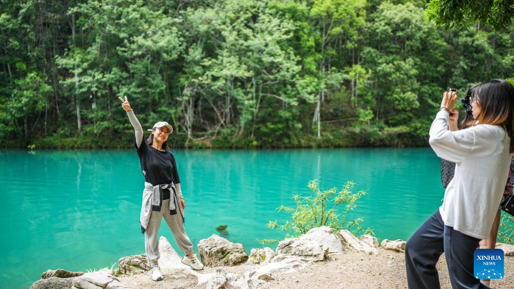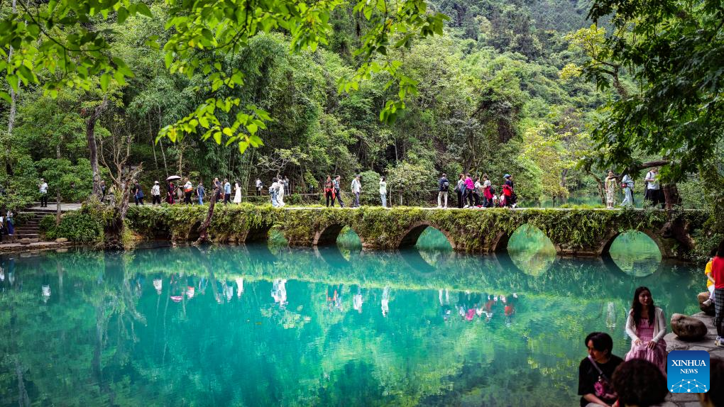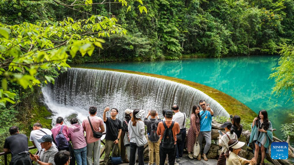 Tourists visit Xiaoqikong scenic area in Libo County, southwest China's Guizhou Province, May 16, 2024. Situated on the steep mountainside of Guizhou, Libo County has spectacular views in abundance and has seen a boom in tourism in recent years. (Xinhua/Tao Liang)