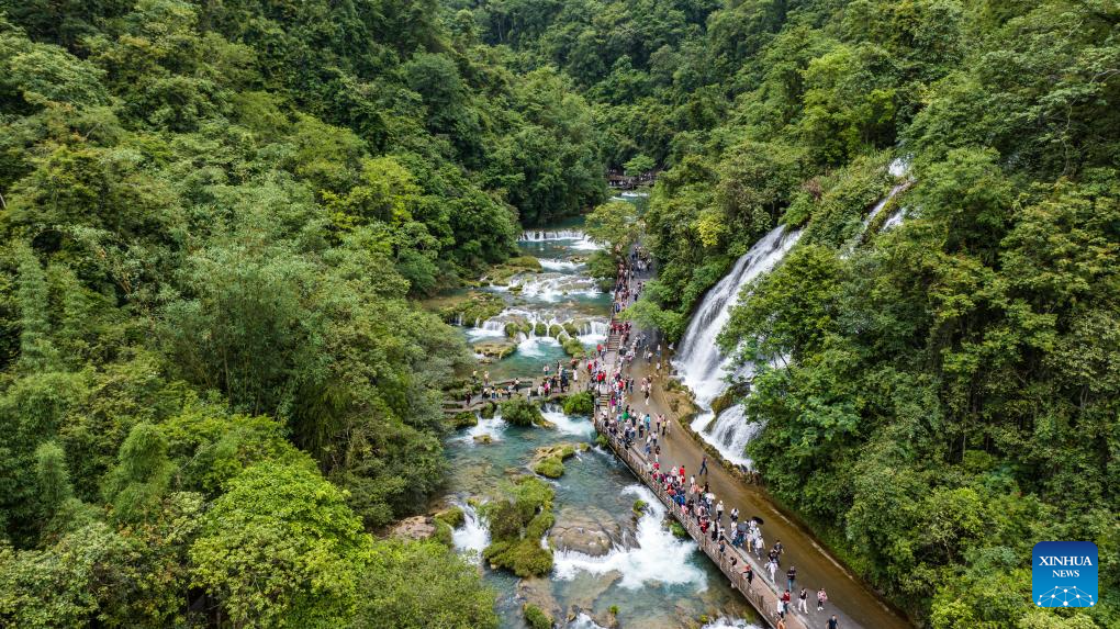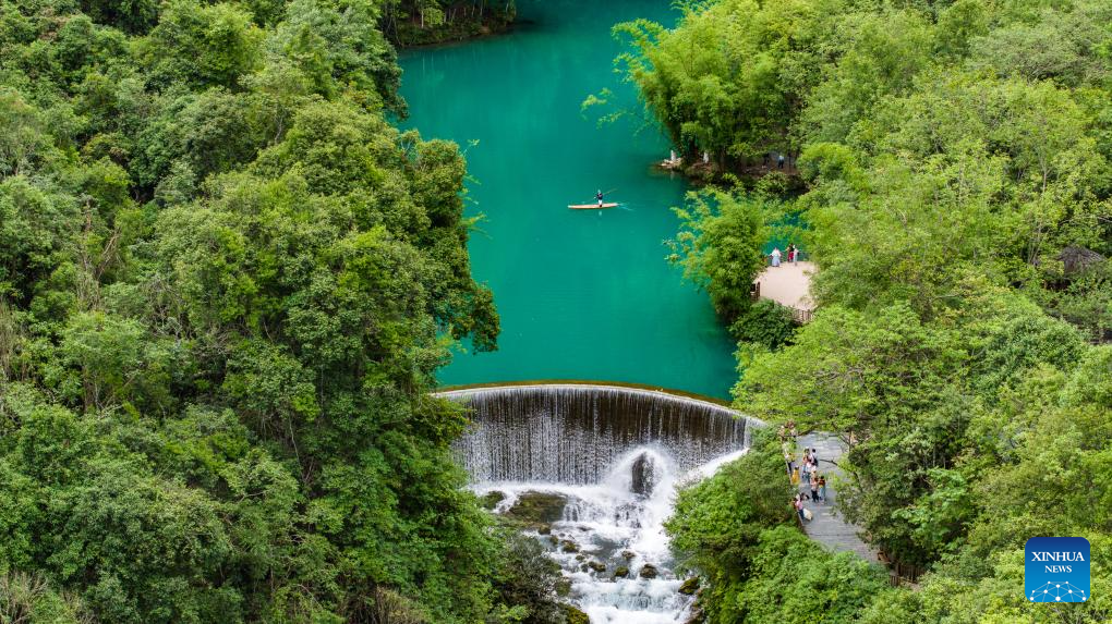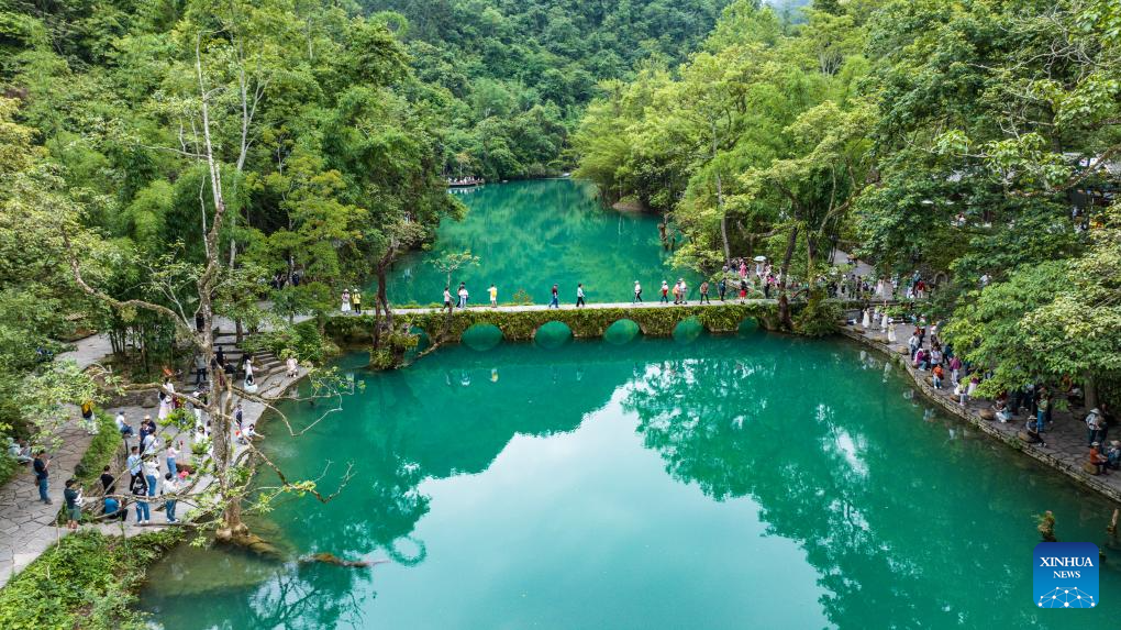 An aerial drone photo taken on May 16, 2024 shows tourists visiting Xiaoqikong scenic area in Libo County, southwest China's Guizhou Province. Situated on the steep mountainside of Guizhou, Libo County has spectacular views in abundance and has seen a boom in tourism in recent years. (Xinhua/Tao Liang)