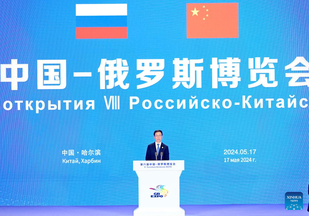 Chinese Vice President Han Zheng speaks at the opening ceremony of the 8th China-Russia Expo in Harbin, northeast China's Heilongjiang Province, May 17, 2024. Han and Russian President Vladimir Putin attended the opening ceremony of the expo here on Friday. Han also read out Chinese President Xi Jinping's congratulatory letter to the expo and made a speech at the opening ceremony. (Xinhua/Yin Bogu)